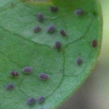 以下は、11月下旬にイスノキの葉裏で見られたアブラムシで、1枚の葉裏に1〜2匹がとまっているのがしばしば見られた。たぶん、ヤノイスアブラムシの有翅産性虫と思われる。いずれも腹部が随分小さい印象があったことから、既に産仔したのであろう。たぶん、イスノキの葉裏にたどり着くと、さっさと産仔するものと思われる。肝心な胎生の幼虫についてであるが、とりあえずは目に入らなかった。 |