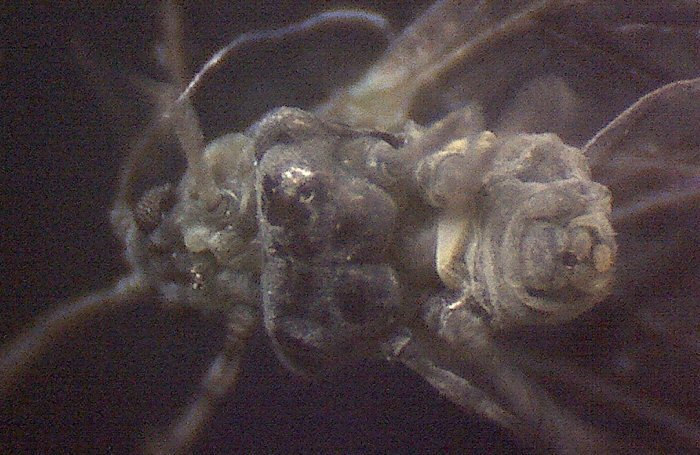 仔虫を産み落としたと思われる有翅産性虫の腹を改めて見てみると、縮んだ蛇腹のような状態となっている。既に役目を終えているから、お迎えが来るのを待っているだけなのであろう。 |