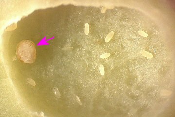 幹母成虫は体長が引き続き1ミリほどしかないが体がパンパンになっており、仔虫を産下する気満々である。 |