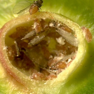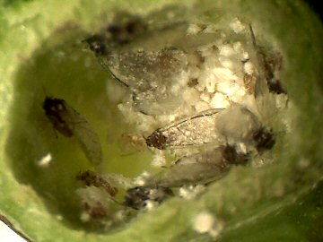 裂開前の虫えいを割ったもので、この例ではまだ成虫と幼虫が入り交じっている。 |
