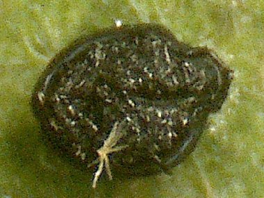仔虫は尻の側から生まれている。間もなくポトリと産み落とされた。お母さん(幹母)が腹側を見せているのは、逃亡防止のため、この状態とさせてもらったものである。 |
